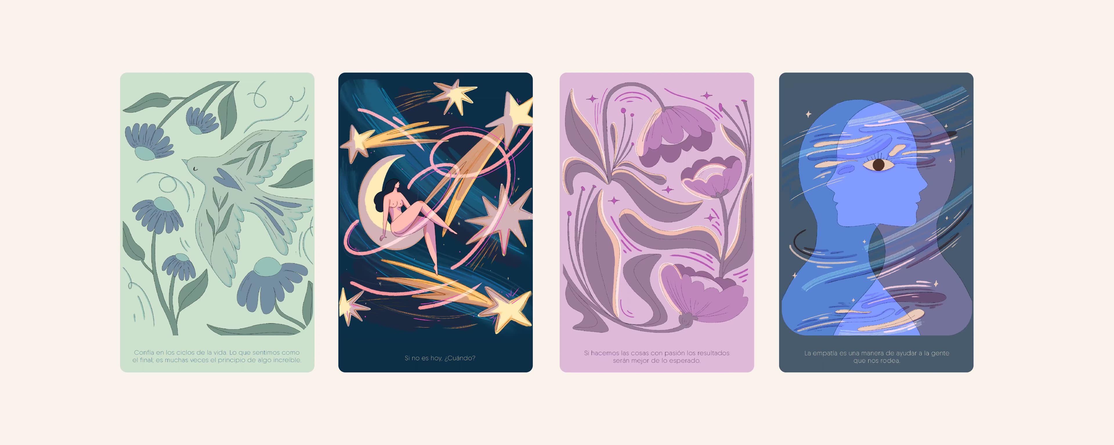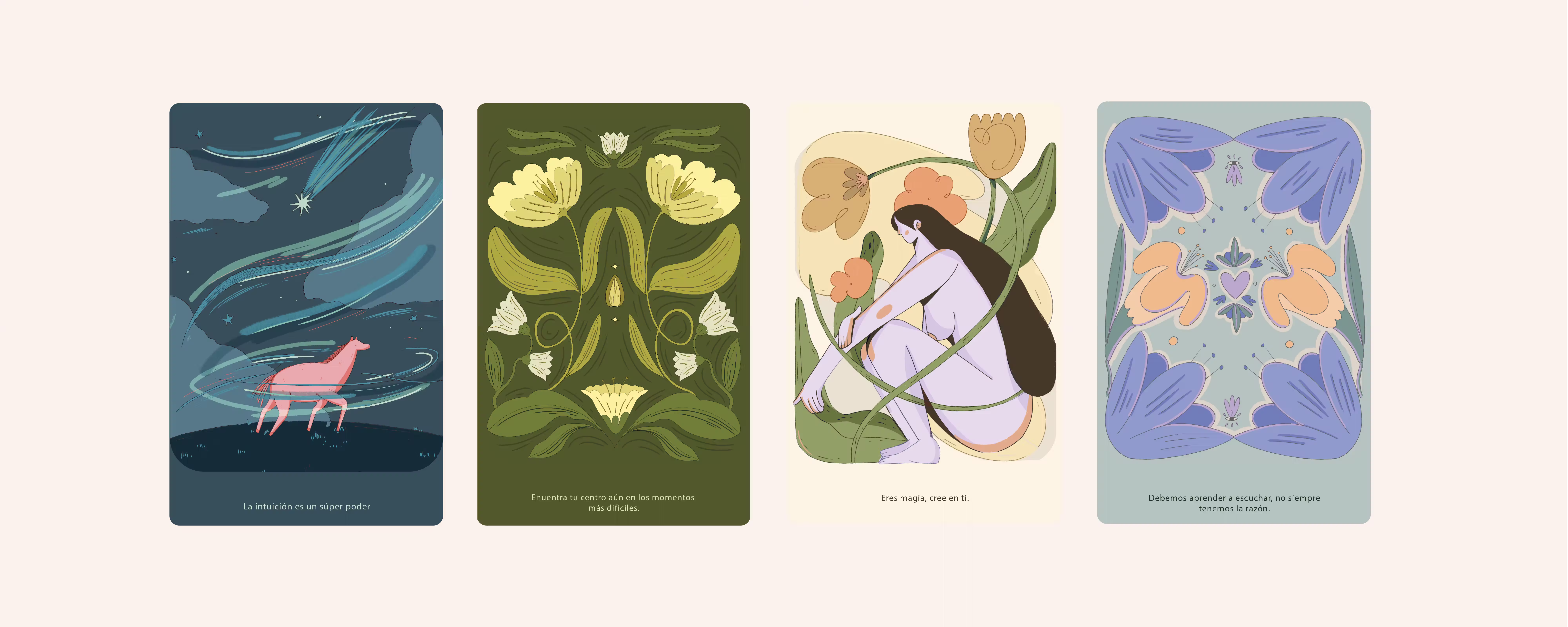En este proyecto realicé las ilustraciones principales que acompañan cada tarjeta, aportando un lenguaje visual delicado y armonioso.